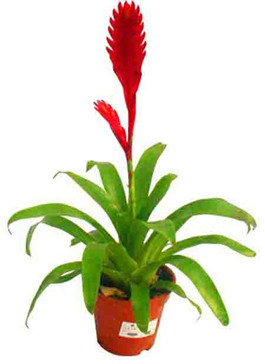 富有異國風情的“鶯歌鳳梨”,以其端莊秀雅、體態輕盈的風貌,陸續進入尋常百姓家。它植株矮壯,葉形似劍,渾身勻稱,花姿奇美。每當冬去春來,葉叢之間就會抽出一簇羽狀紅花,花緣鑲有金邊,內高外低,層疊而上,恍如林間一群黃鶯,前依后偎,歡欣雀躍,顯露出一種“流鶯自惜春將去,銜住飛花不忍啼”的情調,特別是它正當春節盛開,更令人們傾心不已。